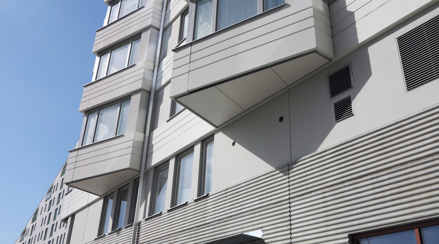 Byggnaden är färgsatt med ljusa fasader vilket ger en positiv inverkan på dagsljus, gaturum och omkringliggande bebyggelse. Eftersom huset är relativt högt och kommer synas på håll är byggnaden utformad som en sammanhängande volym med skulptural gestaltning. Med inspiration från havet rör sig ”vågorna” runt huset. Sinuskorrugerad betong i sockelvåningen och rundade hörn på våningarna där över. Den obehandlade, ljust varmgråa betongen i sockelvåningen förstärker byggandens karaktär och är en referens till områdets historia och närheten till Stapelbädden.
